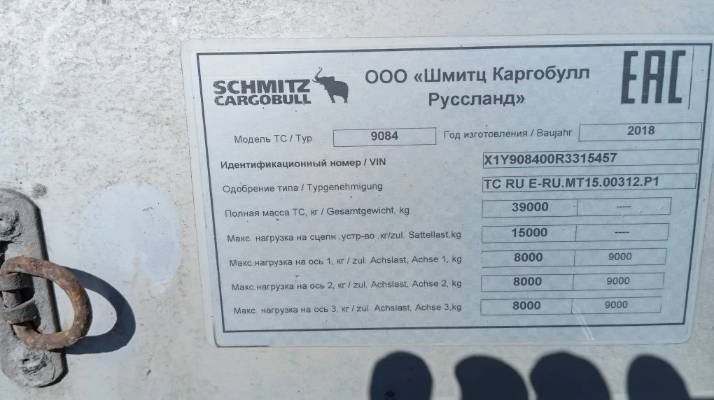 Год выпуска — 2018. Макс. полная масса – 39 000 кг. Собственная масса –6 816 кг. Грузоподъемность – 32 184 кг